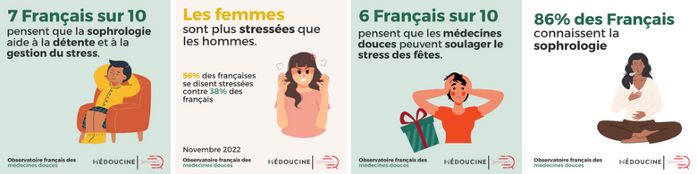 60% des Français pensent que les médecines douces sont de bons accompagnements au stress des fêtes de fin d’année et peuvent aider à gérer ses émotions (57%), maîtriser sa colère (44%), aider dans la communication avec ses proches (36%) ou la gestion des conflits (34%) et … accompagner les pertes de poids post-fêtes (42%) !